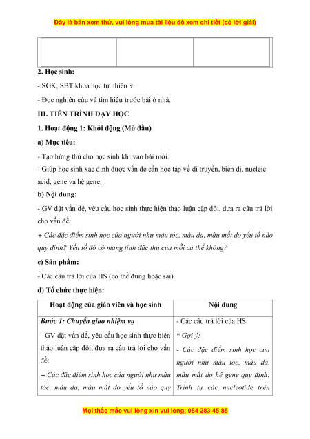 - Giúp học sinh xác định được vấn đề cần học tập về di truyền, biến dị, nucleic acid, gene và hệ gene. b) Nội dung: