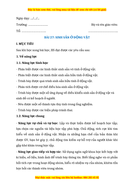 ……………………………….. BÀI 27: SINH S N Ả Đ Ở NG V Ộ T Ậ I. M C TIÊU Ụ Sau khi h c xong bài h ọ c, HS đ ọ t đ ạ c các yêu c ượ u sau: ầ 1. V năng l ề c ự 1.1. Năng l c Sinh h ự c ọ - Phân bi t đ ệ c các hình th ượ c sinh s ứ n vô tính ả đ ở ng v ộ t. ậ - Phân bi t đ ệ c các hình th ượ c sinh s ứ n h ả u tính ữ đ ở ng v ộ t. ậ - Trình bày đ c quá trình sinh s ượ n h ả u tính ữ đ ở ng v ộ t. ậ - Phân tích đ c c ượ ch ơ đi ế u hòa sinh s ề n ả đ ở ng v ộ ật. - Trình bày đ c m ượ t s ộ ố ng d ứ ng v ụ đi ề u khi ề n sinh s ể n ả đ ở ng v ộ t và ậ sinh đ có k ẻ ho ế ch ạ ng ở i. ườ - Nêu đ c m ượ t s ộ thành t ố u th ự tinh trong ụ ng nghi ố m. ệ - Trình bày đ c các bi ượ n pháp tránh thai. ệ 1.2. Năng l c chung ự - Năng l c