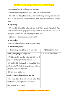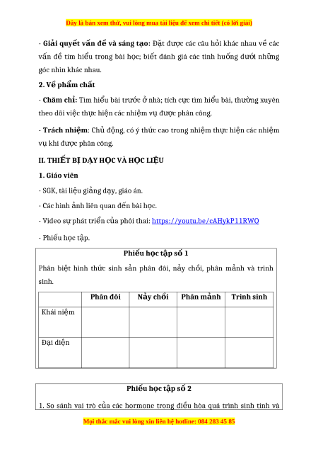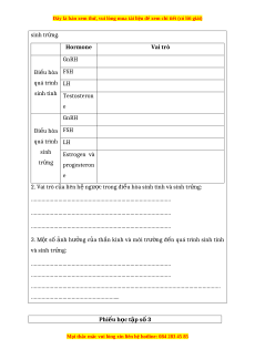ế đánh giá các tình hu ng ố d i ướ nh ng ữ góc nhìn khác nhau. 2. V ph ề m ch ẩ t ấ - Chăm ch : ỉ Tìm hi u ể bài tr c ướ ở nhà; tích c c ự tìm hi u ể bài, th ng ườ xuyên theo dõi vi c th ệ c hi ự n các nhi ệ m v ệ đ ụ c phân công. ượ - Trách nhi m ệ : Chủ đ ng, ộ có ý th c ứ cao trong nhi m ệ th c ự hi n ệ các nhi m ệ v khi đ ụ c phân công. ượ II. THI T B Ế D Ị Y Ạ H C V Ọ À HỌC LIỆU 1. Giáo viên - SGK, tài liệu gi ng d ả y, giáo án. ạ - Các hình nh liên quan đ ả n bài h ế c. ọ - Video s phát tri ự n c ể a phôi thai: ủ https://youtu.be/cAHykP11RWQ - Phi u h ế c ọ t p. ậ Phi u h ế c t ọ p s ậ 1 ố Phân bi t ệ hình th c ứ sinh s n ả phân đôi, n y ả ch i, ồ phân m nh ả và trinh sinh. Phân đôi Nảy chồi Phân m nh ả Trinh sinh Khái ni m ệ Đ i di ạ ện Phiếu học t p s ậ 2 ố 1. So sánh vai trò c a ủ các hormone trong đi u