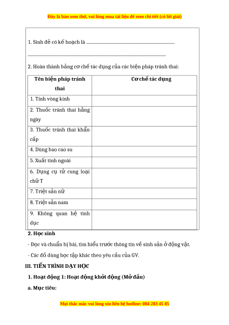 ............................................................................................................................. 2. Hoàn thành b ng c ả ch ơ tác d ế ng c ụ a các bi ủ n pháp tránh thai: ệ Tên bi n pháp tránh ệ C ch ơ tác d ế ng ụ thai 1. Tính vòng kinh 2. Thu c ố tránh thai h ng ằ ngày 3. Thu c ố tránh thai kh n ẩ c p ấ 4. Dùng bao cao su 5. Xu t tinh ngoài ấ 6. D ng ụ cụ tử cung lo i ạ ch T ữ 7. Tri t s ệ n n ả ữ 8. Tri t s ệ n nam ả 9. Không quan hệ tình dục 2. H c ọ sinh - Đ c v ọ à chu n b ẩ