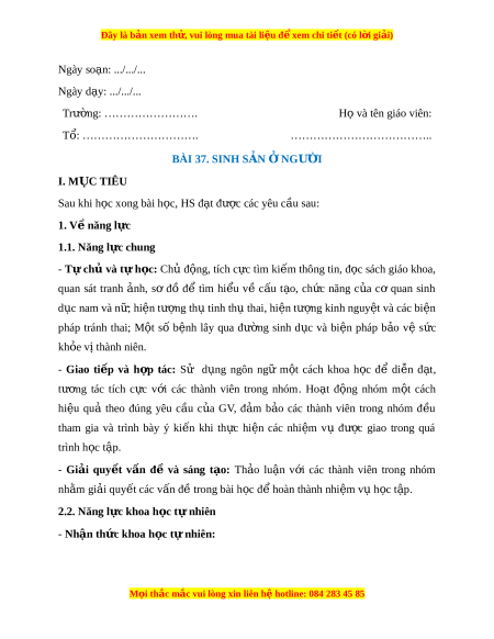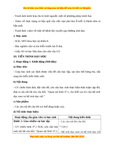 ……………………………….. BÀI 37. SINH S N Ả N Ở GƯ I Ờ I. M C Ụ TIÊU Sau khi h c ọ xong bài h c, H ọ S đ t ạ được các yêu c u s ầ au: 1. V năng l ề c ự 1.1. Năng l c chung ự - Tự chủ và t ự h c: ọ Chủ đ ng, ộ tích c c ự tìm ki m ế thông tin, đ c ọ sách giáo khoa, quan sát tranh nh, ả sơ đồ để tìm hi u ể về c u ấ t o, ạ ch c ứ năng c a ủ cơ quan sinh d c ụ nam và n ; ữ hi n t ệ ư ng t ợ h t ụ inh th t ụ hai, hi n t ệ ư ng ki ợ nh nguy t ệ và các bi n ệ pháp tránh thai; M t ộ số b nh ệ lây qua đư ng ờ sinh d c ụ và bi n ệ pháp b o ả vệ s c ứ kh e ỏ v t ị hành niên. - Giao ti p ế và h p ợ tác: Sử d ng ụ ngôn ngữ m t ộ cách khoa h c ọ để di n ễ đ t ạ , tư ng ơ tác tích c c ự v i