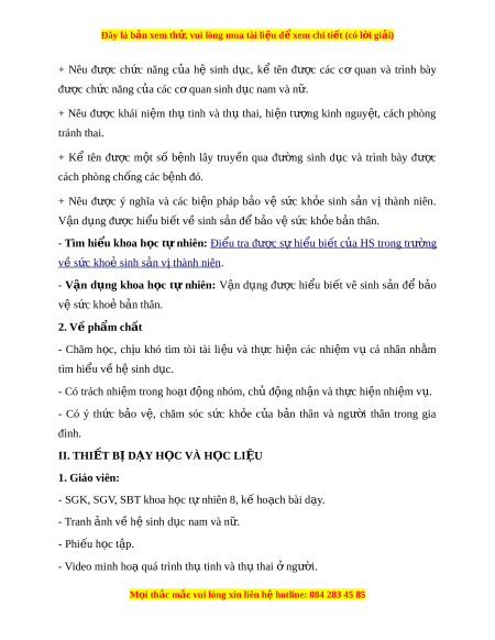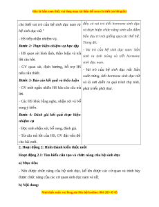 cách phòng chống các bệnh đó. + Nêu đư c ợ ý nghĩa và các bi n ệ pháp b o ả vệ s c ứ kh e ỏ sinh s n ả vị thành niên. V n ậ d ng đ ụ ư c ợ hi u bi ể t ế v s ề inh s n đ ả b ể o ả v s ệ c ứ kh e b ỏ n ả thân. - Tìm hi u khoa h ể c t ọ nhi ự ên: Đi u t ể ra đư c s ợ ự hi u bi ể t ế c a H ủ S trong trư ng ờ v s ề c kho ứ ẻ sinh s n ả v t ị hành niên. - V n ậ d ng ụ khoa h c ọ tự nhiên: V n ậ d ng ụ đư c ợ hi u ể bi t ế vê sinh s n ả để b o ả vệ s c ứ kho b ẻ n t ả hân. 2. V ph ề ẩm ch t ấ - Chăm h c, ọ ch u ị khó tìm tòi tài li u ệ và th c ự hi n ệ các nhi m ệ vụ cá nhân nh m ằ tìm hi u v ể h ề s ệ inh d c. ụ - Có trách nhi m ệ trong ho t ạ đ ng nhóm ộ , ch đ ủ ng nh ộ n ậ và th c hi ự n nhi ệ m ệ v . ụ - Có ý th c ứ b o ả v , ệ chăm sóc s c ứ kh e ỏ c a ủ b n ả thân và ngư i ờ thân trong gia đình. II. THIẾT B D Ị ẠY H C Ọ VÀ H C Ọ LI U Ệ 1. Giáo viên: - SGK, SGV, SBT khoa h c ọ t nhi ự ên 8, k ho ế ch ạ bài d y ạ . - Tranh nh v ả h ề ệ sinh d c nam ụ và n . ữ - Phi u h ế c t ọ p. ậ - Video minh ho quá ạ trình th t ụ inh và th t ụ hai ng ở ư i ờ . M i