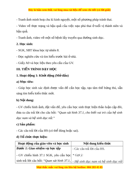 Đây là bản xem th , vu ử i lòng mua tài li u ệ đ xe ể m chi ti t (c ế ó l i ờ gi i ả ) - Tranh nh m ả inh hoạ chu kì kinh nguy t ệ , m t ộ số phư ng pháp t ơ ránh thai. - Video về th c ự tr ng ạ và h u ậ quả c a ủ vi c ệ n o ạ phá thai ở tu i ổ vị thành niên và h u ậ qu . ả - Tranh nh, vi ả deo vẽ m t ộ số bệnh lầy truy n ề qua đư ng s ờ inh d c. ụ 2. H c ọ sinh: - SGK, SBT khoa h c ọ t nhi ự ên 8. - Đ c nghi ọ ên c u ứ và tìm hi u t ể rư c ớ bài nhà. ở - Giấy A0 và h c ọ li u t ệ heo yêu c u c ầ a ủ GV. III. TI N Ế TRÌNH D Y Ạ H C Ọ 1. Hoạt đ ng 1 ộ : Kh i ở đ ng ( ộ M đ ở u) ầ a) M c t ụ iêu: - Giúp h c ọ sinh xác đ nh ị đư c ợ v n ấ đề c n ầ h c ọ t p, ậ t o ạ tâm thế h ng ứ thú, s n ẵ sàng tìm hi u ki ể n t ế h c m ứ i ớ . b) N i ộ dung: - GV chi u ế hình nh, ả đ t ặ v n ấ đ , ề yêu c u ầ h c ọ sinh th c ự hi n ệ th o ả lu n ậ c p ặ đôi, đ a ư ra câu trả l i ờ cho câu h i