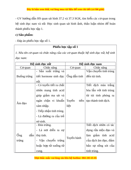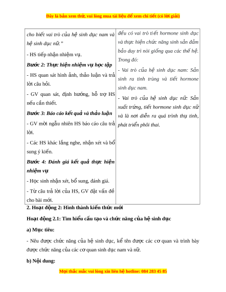 Đây là bản xem th , vu ử i lòng mua tài li u ệ đ xe ể m chi ti t (c ế ó l i ờ gi i ả ) cho bi t ế vai trò c a ủ hệ sinh d c ụ nam và đ u ê co vai trò ti t ế hormone sinh d c ụ hệ sinh d c n ụ . ữ ” và th c ư hi n ệ ch c ư năng sinh s n a đ m a b o a duy trì nòi gi ng ô qua các th ế h . ệ - HS ti p nh ế n ậ nhi m ệ v . ụ Trong đo: Bư c ớ 2: Th c hi ự n nhi ệ m ệ v h ụ c t ọ p ậ - Vai trò c a ủ hệ sinh d c ụ nam: S n a - HS quan sát hình nh, ả th o ả lu n