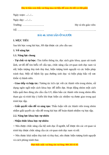 ……………………………….. BÀI 40. SINH SẢN N Ở GƯ I Ờ I. M C Ụ TIÊU Sau khi h c ọ xong bài h c, H ọ S đ t ạ được các yêu c u s ầ au: 1. V năng l ề c ự 1.1. Năng l c chung ự