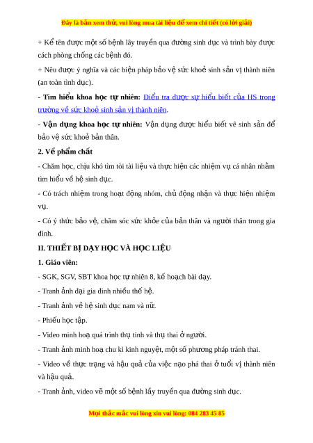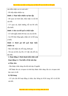cách phòng chống các bệnh đó. + Nêu đư c ợ ý nghĩa và các bi n ệ pháp b o ả v ệ s c ứ kho ẻ sinh s n ả v ịthành niên (an toàn tình d c) ụ . - Tìm hi u ể khoa h c ọ tự nhiên: Đi u ể tra đư c ợ sự hi u ể bi t ế c a ủ HS trong trư ng v ờ s ề c kho ứ ẻ sinh s n v ả ị thành niên. - Vận d ng ụ khoa h c ọ tự nhiên: V n ậ d ng ụ đư c ợ hi u ể bi t ế vê sinh s n ả để b o ả v s ệ c kho ứ b ẻ n ả thân. 2. V ph ề ẩm ch t ấ - Chăm h c, ọ ch u ị khó tìm tòi tài li u ệ và th c ự hi n ệ các nhi m ệ v cá ụ nhân nh m ằ tìm hi u v ể h ề s ệ inh d c. ụ - Có trách nhi m ệ trong ho t ạ đ ng ộ nhóm, chủ đ ng ộ nh n ậ và th c ự hi n ệ nhi m ệ v . ụ - Có ý th c ứ b o ả v , ệ chăm sóc s c ứ kh e ỏ c a ủ b n ả thân và ngư i ờ thân trong gia đình. II. THIẾT B D Ị ẠY H C Ọ VÀ H C Ọ LI U Ệ 1. Giáo viên: - SGK, SGV, SBT khoa h c t ọ nhi ự ên 8, k ho ế ch ạ bài d y ạ . - Tranh nh đ ả i ạ gia đinh nhi u t ề h h ế . ệ - Tranh nh v ả h ề ệ sinh d c nam ụ và n . ữ - Phi u h ế c t ọ p ậ . - Video minh ho quá ạ trình th t ụ inh và th t ụ hai ở ngư i ờ . - Tranh nh m ả inh hoạ chu kì kinh nguy t ệ , m t ộ số phư ng pháp t ơ ránh thai. - Video về th c ự tr ng ạ và h u ậ quả c a ủ vi c ệ n o ạ phá thai ở tu i ổ vị thành niên và h u ậ qu . ả - Tranh nh, vi ả deo vẽ m t ộ số bệnh lầy truy n ề qua đư ng s ờ inh d c. ụ M i