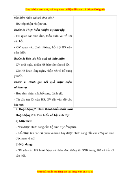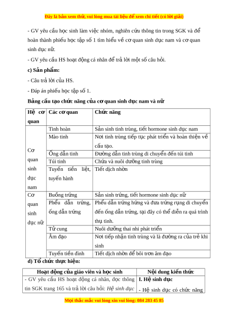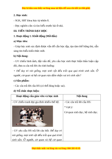 Đây là bản xem th , vu ử i lòng mua tài li u ệ đ xe ể m chi ti t ế (có l i ờ gi i ả ) 2. H c ọ sinh: - SGK, SBT khoa h c ọ t nhi ự ên 8. - Đ c nghi ọ ên c u ứ và tìm hi u t ể rư c ớ bài nhà. ở III. TI N Ế TRÌNH D Y Ạ H C Ọ 1. Hoạt đ ng 1 ộ : Kh i ở đ ng ( ộ M đ ở u) ầ a) Mục tiêu: - Giúp h c ọ sinh xác đ nh ị đư c ợ v n ấ đ c ề n ầ h c ọ t p, ậ t o ạ tâm th ế h ng ứ thú, s n ẵ sàng tìm hi u ki ể n t ế h c m ứ i ớ . b) N i ộ dung: - GV chi u ế hình nh, ả đ t ặ v n ấ đ , ề yêu c u ầ h c ọ sinh th c ự hi n ệ th o ả lu n ậ c p ặ đôi, đ a ư ra câu trả l i ờ cho tình hu ng: ố