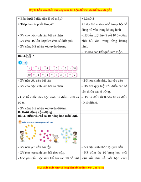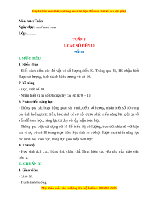 ế 10. Thông qua đó, HS nh n ậ bi t ế đư c ợ số lư ng, hì ợ nh thành bi u t ể ư ng ợ v s ề 10. ố 2. Kĩ năng - Đ c, vi ọ t ế số 10. - Nh n bi ậ t ế v t ị rí s 0 t ố rong dãy các s t ố 0 – 10. ừ 3. Phát tri n nă ể ng l c ự - Thông qua các ho t ạ đ ng ộ quan sát tranh, đ m ế số lư ng, ợ nh n ậ bi t ế s ố 10 trong các tình hu ng ố th c ự ti n, ễ h c ọ sinh có c ơ h i ộ đư c ợ phát tri n ể năng l c ự gi i ả quy t ế vấn đ t ề oán h c, ọ năng l c t ự duy và l ư p ậ lu n t ậ oán h c. ọ - Thông qua vi c ệ sử d ng ụ số 10 để bi u ể thị số lư ng, ợ trao đ i ổ chia sẻ v i ớ b n ạ
