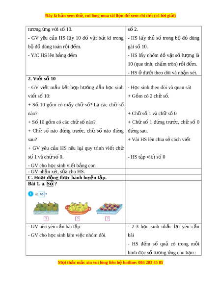 ọ sinh theo dõi và quan sát vi t ế số 10: + Gồm có 2 ch s ữ . ố + Số 10 g m ồ có m y ấ chữ s ? ố Là các chữ số nào? + Ch s ữ ố 1 và ch s ữ 0 ố + Số 10 gồm có các ch s ữ nào? ố + Chữ số 1 đ ng ứ trư c, ớ chữ số 0 + Chữ số nào đ ng ứ trư c, ớ chữ số nào đ ng ứ đ ng s ứ au. sau? + Vài HS lên chia s cách vi ẻ t ế + GV yêu c u ầ HS nêu l i ạ quy trình vi t ế chữ số 1 và ch s ữ ố 0. - HS t p ậ vi t ế s 0 ố - GV cho h c s ọ inh vi t ế b ng con ả - GV nh n xét ậ , s a ử cho HS. C. Hoạt đ ng t ộ h c hành l ự uy n t ệ p. ậ Bài 1. a. Số ? - GV nêu yêu cầu bài t p ậ - 2-3 h c ọ sinh nh c ắ l i ạ yêu c u ầ - GV cho h c s ọ inh làm vi c nhóm ệ đôi. bài - HS đ m ế số quả có trong m i ỗ hình đ c s ọ ố tư ng ơ ng cho b ứ n : ạ M i