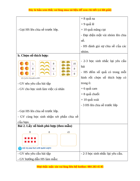 - HS đánh giá sự chia sẻ c a ủ các nhóm. b. Ch n s ọ t ố hích h p ợ : - 2-3 h c ọ sinh nh c ắ l i ạ yêu c u ầ bài - HS đ m ế số quả có trong m i ỗ hình r i ồ ch n ọ số thích h p ợ có - GV nêu yêu cầu bài t p ậ trong ô: - GV cho h c s ọ inh làm vi c cá ệ nhân + 6 qu cam ả + 8 qu chu ả ối + 10 qu xoài ả - 3 HS lên chia s t ẻ rước l p ớ - G i ọ HS lên chia sẻ trư c ớ l p. ớ - GV cùng h c ọ sinh nh n ậ xét ph n ầ chia sẻ c a ủ b n. ạ