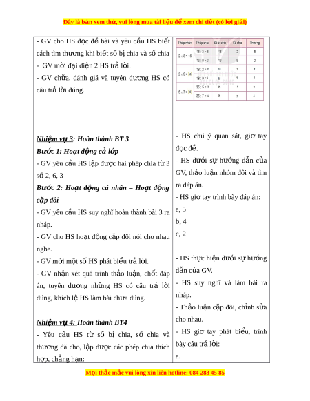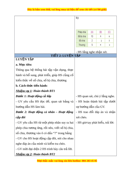 Đây là bản xem th , vu ử i lòng mua tài li u ệ đ xe ể m chi ti t (c ế ó l i ờ gi i ả ) HOẠT Đ N Ộ G C A Ủ GV HOẠT Đ N Ộ G C A Ủ HS TI T Ế 1: S B Ố C Ị HIA, S C Ố HIA, THƯ N Ơ G I. KHÁM PHÁ a. Mục tiêu: - T o ạ tâm th ế h ng ứ thú cho HS và t ng ừ bư c ớ làm quen bài h c. ọ - HS bư c ớ đ u ầ làm quen v i ớ số bị chia, số chia, thư ng ơ trpng phép chia b. Cách th c ứ ti n hàn ế h: