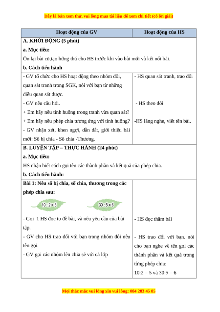 - HS bước đầu biết gọi tên các thành phần và kết quả của phép chia.
