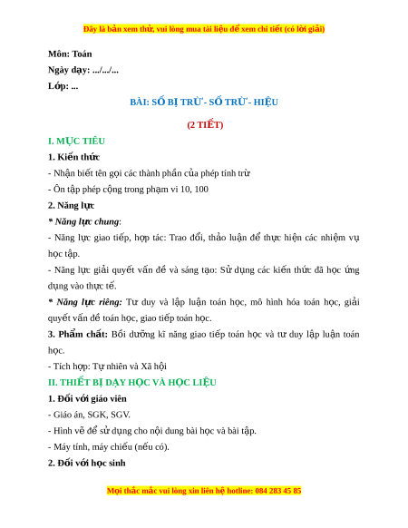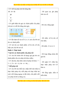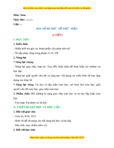 Ngày dạy: .../.../... L p: ớ ... BÀI: S B Ố Ị TRỪ - S Ố TR - Ừ HIỆU (2 TIẾT) I. M C Ụ TIÊU 1. Ki n t ế h c ứ - Nh n bi ậ t ế tên g i ọ các thành ph n c ầ a ủ phép tính trừ - Ôn t p phép ậ c ng t ộ rong ph m ạ vi 10, 100 2. Năng l c ự