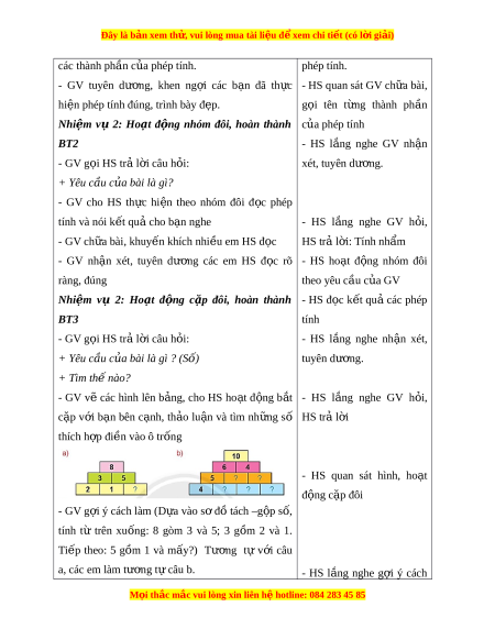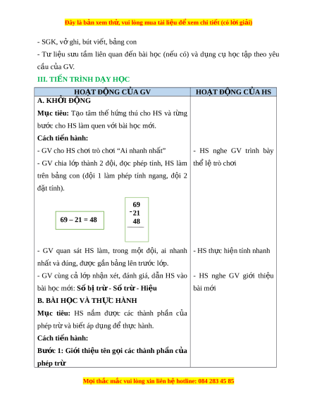 Đây là bản xem th , vu ử i lòng mua tài li u ệ đ xe ể m chi ti t (c ế ó l i ờ gi i ả ) - SGK, v ghi ở , bút vi t ế , b ng con ả - Tư li u ệ s u ư t m ầ liên quan đ n ế bài h c ọ (n u ế có) và d ng ụ cụ h c ọ t p ậ theo yêu cầu c a ủ GV. III. TI N Ế TRÌNH D Y Ạ H C Ọ HOẠT Đ N Ộ G C A Ủ GV HOẠT Đ N Ộ G C A Ủ HS A. KH I Ở Đ N Ộ G Mục tiêu: T o ạ tâm thế h ng ứ thú cho HS và t ng ừ bư c ớ cho HS làm quen v i ớ bài h c ọ m i ớ . Cách ti n hà ế nh: - GV cho HS ch i ơ trò ch i ơ “Ai nhanh nh t ấ ” - HS nghe GV trình bày - GV chia l p ớ thành 2 đ i ộ , đ c ọ phép tính, HS làm th l ể t ệ rò ch i ơ trên b ng ả con (đ i