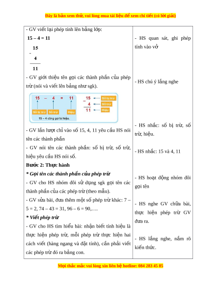 Đây là bản xem th , vu ử i lòng mua tài li u ệ đ xe ể m chi ti t (c ế ó l i ờ gi i ả ) - GV vi t ế l i ạ phép tính lên b ng l ả p: ớ 15 – 4 = 11 - HS quan sát, ghi phép tính vào vở - GV gi i ớ thi u ệ tên g i ọ các thành ph n ầ c a ủ phép - HS chú ý l ng ắ nghe tr ( ừ nói và vi t ế lên b ng nh ả s ư gk). - HS nh c: ắ số bị tr , ừ số - GV l n ầ lư t ợ chỉ vào s ố 15, 4, 11 yêu c u ầ HS nói tr , hi ừ ệu. tên các thành ph n ầ