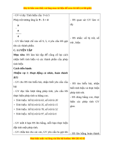 - GV quan sát HS làm, trong m t ộ đ i ộ , ai nhanh - HS th c ự hi n t ệ ính nhanh nhất và đúng, đư c ợ g n b ắ ng ả lên trư c ớ l p. ớ - GV cùng cả l p ớ nh n ậ xét, đánh giá, d n ẫ HS vào - HS nghe GV gi i ớ thi u ệ bài h c ọ m i ớ : S b ố t ị r - ừ S t ố r - ừ Hi u ệ bài m i ớ B. BÀI H C Ọ VÀ TH C Ự HÀNH Mục tiêu: HS n m ắ đư c ợ các thành ph n ầ c a ủ phép tr và bi ừ t ế áp d ng ụ đ t ể h c hành. ự Cách ti n hà ế nh: Bước 1: Gi i ớ thi u ệ tên g i ọ các thành ph n ầ c a ủ phép trừ M i