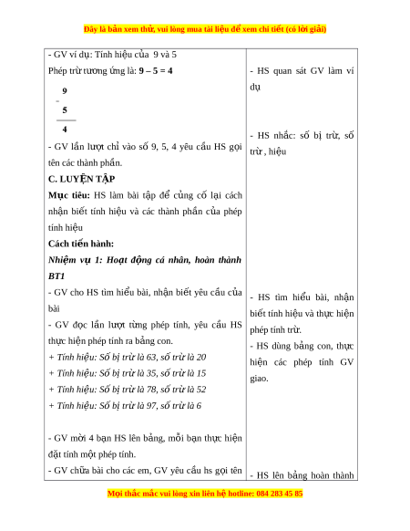 Đây là bản xem th , vu ử i lòng mua tài li u ệ đ xe ể m chi ti t (c ế ó l i ờ gi i ả ) - GV ví d : ụ Tính hi u c ệ a ủ 9 và 5 Phép tr t ừ ư ng ơ ng l ứ à: 9 – 5 = 4 - HS quan sát GV làm ví dụ - HS nh c: ắ số bị tr , ừ số - GV l n ầ lư t