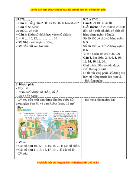Vì 9 > 6 nên 29 100 > 26 100 Câu 4. Em đi n: ề 2, 4, 6, 8, 10, 12, 14, 16, 18, 20. Gi i ả thích: Dãy s t ố rên đư c ợ vi t ế theo quy lu t ậ : Đi t t ừ rái sang ph i ả , s đ ố ng s ứ au h n ơ số đ ng t ứ rư c ớ hai đ n v ơ . ị - HS l ng nghe. ắ 2. Khám phá: - Mục tiêu: + Nh n bi ậ t ế đư c ợ s ch ố n, ẵ s l ố . ẻ - Cách ti n hành: ế - GV yêu cầu m t ộ b n ạ đ ng l ứ ên đ c cu ọ c ộ h i ộ - HS xung phong đ c bài ọ . tho i ạ gi a b ữ n ạ Mi và b n ạ Robot (trang 12 sgk) - GV nêu: