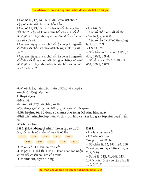 ọ sinh nêu các số ch n và ẵ các số 457; 8 341; 5 095. lẻ có 4 ch s ữ ố? - GV k t ế lu n, ậ nh n xét ậ , tuyên dư ng, ơ và chuy n ể sang ho t ạ đ ng t ộ i p t ế heo. 3. Hoạt đ ng ộ - Mục tiêu: - Nh n ậ bi t ế đư c ợ s ch ố n, s ẵ ố l . ẻ -V n ậ d ng gi ụ i