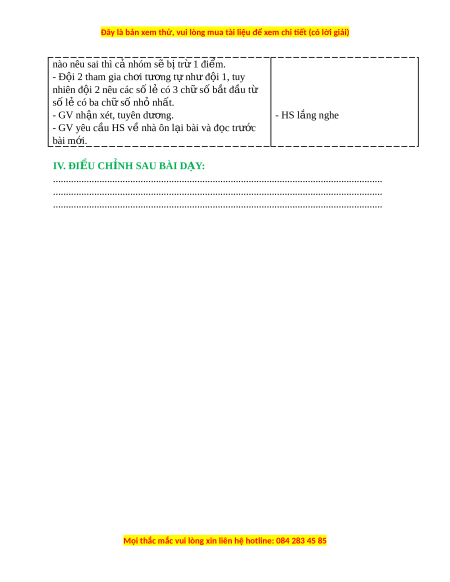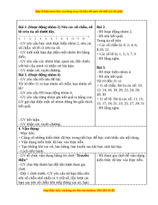 ả thích 15; 17; 19; 21; 23; 25; 27; 29; 31 k t ế qu . ả - HS l ng nghe. ắ - GV k t ế lu n. ậ - GV nh n ậ xét, tuyên dư ng. ơ 4. Vận d ng: ụ - M c t ụ iêu: + C ng c ủ ố nh ng ki ữ n t ế h c ứ đã h c t ọ rong ti t ế h c đ ọ h ể c ọ sinh kh c ắ sâu n i ộ dung. + V n ậ d ng ki ụ n t ế h c đã h ứ c ọ vào th c t ự i n. ễ + T o không khí ạ vui v , hào h ẻ ng, l ứ u l ư uy n s ế au khi h c s ọ inh bài h c. ọ - Cách ti n hành: ế - GV tổ ch c v ứ n ậ d ng b ụ ng t ằ rò ch i ơ “Truy n ề - HS tham gia ch i ơ đ v ể n ậ d ng ụ đi n” ệ ki n t ế h c ứ đã h c vào t ọ h c ự ti n. ễ - GV chia l p t ớ hành hai đ i ộ l n l ầ ư t ợ tham gia ch i ơ . - Đ i ộ 1 ch i ơ trước, GV yêu c u t ầ b ừ n đ ạ u t ầ iên nêu số ch n ẵ nh nh ỏ ất có 3 ch s ữ ố, l n l ầ ư t ợ các b n s ạ au nên số ch n ẵ liên ti p đ ế ng s ứ au nó, b n ạ