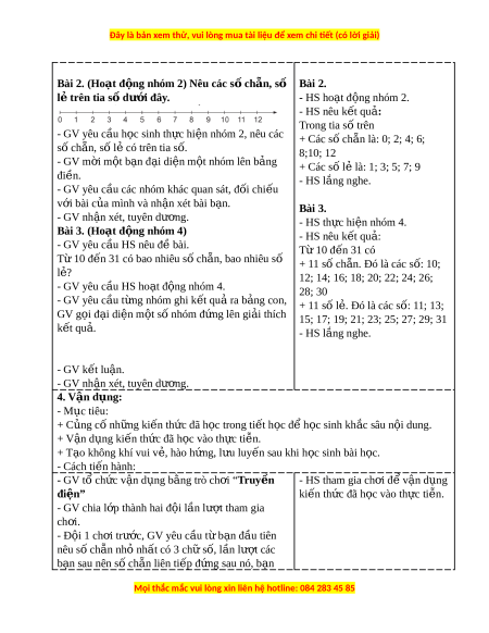 Bài 2. (Hoạt đ ng nhó ộ m 2) Nêu các s ch ố ẵn, số Bài 2. l t ẻ rên tia số dư i ớ đây. - HS ho t ạ đ ng nhóm ộ 2. - HS nêu k t ế quả: Trong tia số trên - GV yêu cầu h c ọ sinh th c hi ự n nhóm ệ 2, nêu các + Các s ch ố n ẵ là: 0; 2; 4; 6; số ch n, ẵ số l có t ẻ rên tia s . ố 8;10; 12 - GV m i ờ m t ộ b n ạ đ i ạ di n m ệ t ộ nhóm lên b ng ả + Các s l ố l ẻ à: 1; 3; 5; 7; 9 đi n. ề - HS l ng nghe. ắ