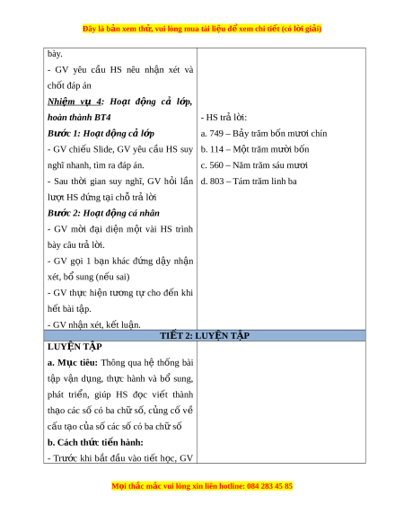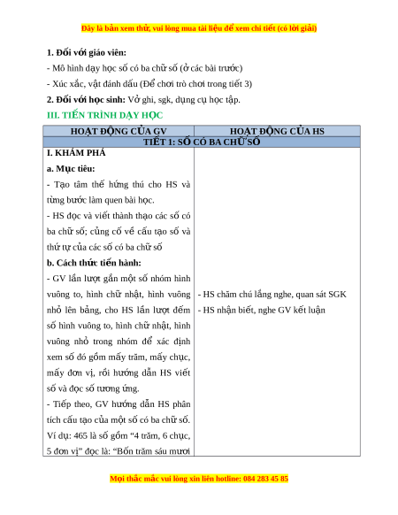 Đây là bản xem th , vu ử i lòng mua tài li u ệ đ xe ể m chi ti t (c ế ó l i ờ gi i ả ) 1. Đ i ố v i ớ giáo viên: - Mô hình d y ạ h c s ọ có ố ba ch s ữ ( ố các ở bài trư c) ớ - Xúc x c, ắ v t ậ đánh d u ( ấ Đ ch ể i ơ trò ch i ơ trong ti t ế 3) 2. Đ i ố v i ớ h c s ọ inh: V ghi ở , sgk, d ng c ụ h ụ c t ọ p. ậ III. TI N Ế TRÌNH D Y Ạ H C Ọ HOẠT Đ N Ộ G C A Ủ GV HOẠT Đ N Ộ G C A Ủ HS TIẾT 1: S C Ố Ó BA CHỮ SỐ I. KHÁM PHÁ a. Mục tiêu: - T o ạ tâm thế h ng ứ thú cho HS và t ng b ừ ư c ớ làm quen bài h c. ọ - HS đ c ọ và vi t ế thành th o ạ các số có ba chữ số; c ng ủ cố về c u ấ t o ạ số và th t ứ c ự a ủ các số có ba ch s ữ ố b. Cách th c ứ ti n hàn ế h: - GV l n ầ lư t ợ g n ắ m t ộ số nhóm hình vuông to, hình chữ nh t