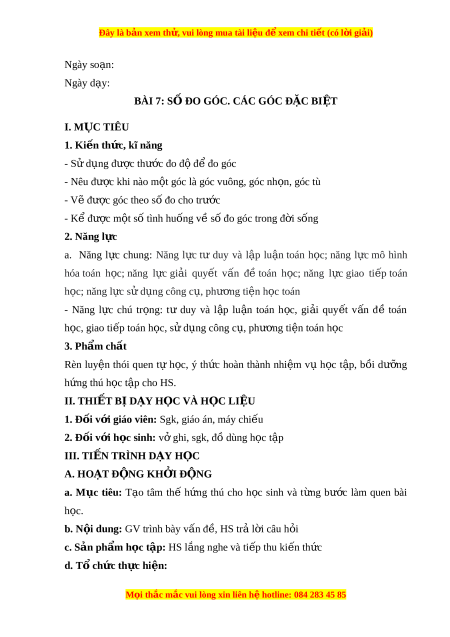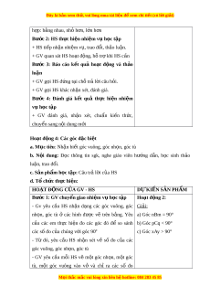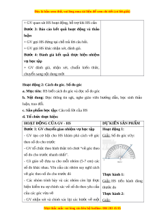 ộ góc là góc vuông, góc nh n, góc t ọ ù - Vẽ đư c góc ợ theo số đo cho trước - Kể đư c m ợ t ộ số tình huống v s ề ố đo góc trong đ i ờ sống 2. Năng l c ự a. Năng l c ự chung: Năng l c ự tư duy và l p ậ lu n ậ toán h c; ọ năng l c ự mô hình hóa toán h c; ọ năng l c ự gi i ả quy t ế v n ấ đề toán h c; ọ năng l c ự giao ti p ế toán h c; ọ năng l c ự s d ử ng ụ công c , ph ụ ư ng ơ ti n ệ h c ọ toán - Năng l c ự chú tr ng: ọ tư duy và l p ậ lu n ậ toán h c, ọ gi i ả quy t ế v n ấ đề toán h c, gi ọ ao ti p t ế oán h c, ọ s d ử ng ụ công c , ph ụ ư ng ơ ti n t ệ oán h c ọ 3. Ph m ẩ chất Rèn luy n ệ thói quen tự h c, ọ ý th c ứ hoàn thành nhi m ệ vụ h c ọ t p, ậ b i ồ dư ng ỡ h ng t ứ hú h c t ọ p ậ cho HS.