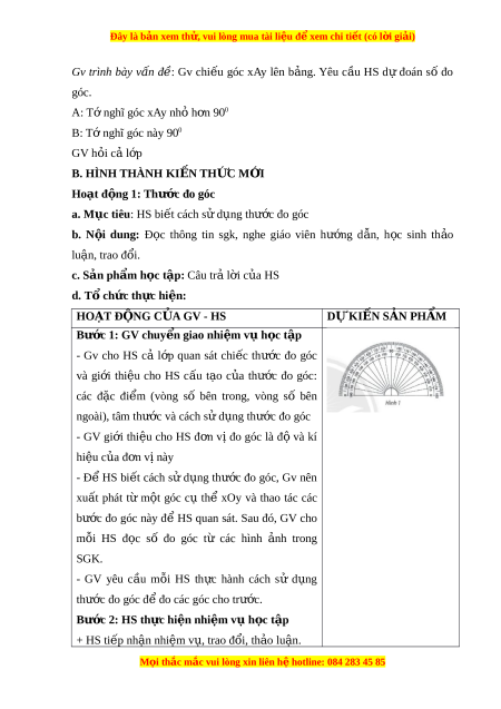 B. HÌNH THÀNH KI N Ế TH C Ứ M I Ớ Hoạt đ ng 1: ộ Thư c ớ đo góc a. Mục tiêu: HS bi t ế cách s d ử ng t ụ hư c ớ đo góc b. N i ộ dung: Đ c