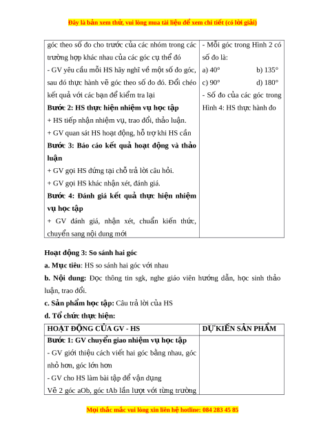 ự hành vẽ góc theo số đo đó. Đ i ổ chéo c) 90° d) 180° k t ế qu v ả i ớ các b n ạ đ ki ể m ể tra l i ạ - Số đo c a ủ các góc trong Bư c ớ 2: HS th c hi ự n nhi ệ m ệ v h ụ c t ọ p ậ Hình 4: HS th c hành đo ự + HS ti p ế nh n nhi ậ m ệ v , t ụ rao đ i ổ , th o ả lu n. ậ + GV quan sát HS ho t ạ đ ng, ộ h t ỗ r khi ợ HS c n ầ Bư c ớ 3: Báo cáo k t ế quả ho t ạ đ ng ộ và th o ả luận + GV g i ọ HS đ ng ứ t i ạ ch t ỗ r l ả i ờ câu h i ỏ . + GV g i ọ HS khác nh n xét ậ , đánh giá. Bư c ớ 4: Đánh giá k t ế quả th c ự hi n ệ nhi m ệ vụ h c t ọ ập + GV đánh giá, nh n ậ xét, chu n ẩ ki n ế th c, ứ chuy n s ể ang n i ộ dung m i ớ Hoạt đ ng ộ 3: So sánh hai góc