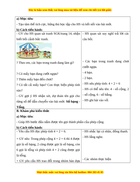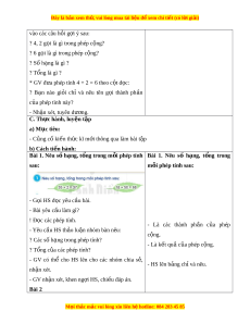 ạ - - HS ghi bài vào v . ở T ng. ổ B. Khám phá ki n t ế h c ứ a) M c t ụ iêu: - Giúp HS bư c đ ớ ầu n m ắ đư c t ợ ên g i ọ thành ph n c ầ a ủ phép c ng. ộ b) Cách ti n hành ế : - Yêu cầu HS đ c phép t ọ ính 4 + 2 = 6. - HS nh c l ắ i ạ cá nhân, đ ng t ồ hanh. - HS l ng nghe. ắ + GV nêu: Trong phép c ng ộ 4 + 2 = 6 thì 4 đư c ợ g i ọ là s ố h ng, ạ 2 cũng đư c ợ g i ọ là s ố h ng, ạ còn 6 g i ọ là t ng