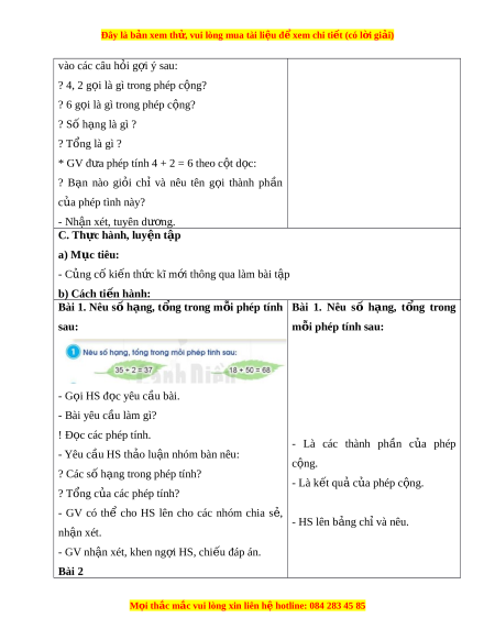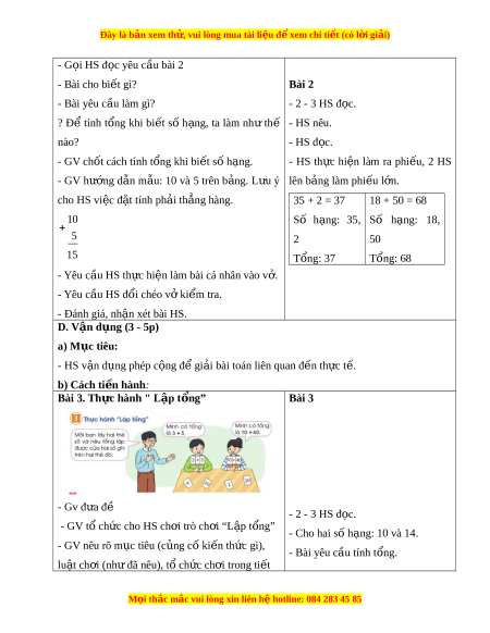 Đây là bản xem th , vu ử i lòng mua tài li u ệ đ xe ể m chi ti t (c ế ó l i ờ gi i ả ) - G i ọ HS đ c yêu ọ c u bài ầ 2 - Bài cho bi t ế gì? Bài 2 - Bài yêu c u l ầ àm gì? - 2 - 3 HS đ c. ọ ? Để tính t ng ổ khi bi t ế số h ng, ạ ta làm nh ư thế - HS nêu. nào? - HS đ c. ọ