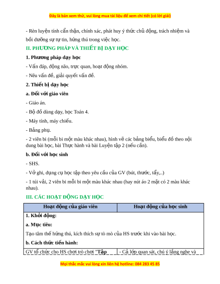 - Rèn luy n t ệ ính c n t ẩ h n, chí ậ nh xác, phát huy ý th c ch ứ đ ủ ng, ộ trách nhi m ệ và bồi dư ng s ỡ ự t t ự in, h ng t ứ hú trong vi c h ệ c. ọ II. PHƯ N Ơ G PHÁP VÀ THI T Ế B D Ị Y Ạ H C Ọ 1. Phư ng ơ pháp d y h ạ c ọ - Vấn đáp, đ ng ộ não, tr c ự quan, ho t ạ đ ng nhóm ộ . - Nêu vấn đ , gi ề i ả quy t ế v n đ ấ . ề 2. Thi t ế b d ị y h ạ c ọ a. Đ i ố v i ớ giáo viên - Giáo án. - Bộ đồ dùng d y ạ , h c ọ Toán 4. - Máy tính, máy chi u. ế - B ng ả ph . ụ - 2 viên bi (mỗi bi m t