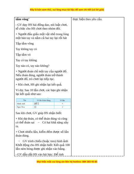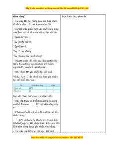 tầm vông" th c ự hi n t ệ heo yêu c u. ầ - GV d y ạ HS bài đ ng dao, nói ồ lu t ậ ch i ơ , tổ ch c ứ cho HS ch i ơ theo nhóm đôi. + Ngư i ờ đ u gi ấ u m ấ t ộ v t ậ nh t ỏ rong lòng m t ộ bàn tay và n m ắ c hai ả tay l i ạ r i ồ hát T p t ậ ầm vông Tay không tay có T p t ậ ầm vó Tay có tay không Tay nào có, tay nào không? + Ngư i ờ đoán ch m ỉ t ộ tay c a ủ ngư i ờ đ . ố N u đoán đúng, ng ế ư i ờ đoán tr t ở hành ngư i ờ đố, trò ch i ơ l i ạ ti p t ế c. ụ + Khi ch i ơ , HS ghi nh n l ậ i ạ k t ế qu . ả Ví d : ụ Sau 10 l n ch ầ i ơ , các b n ạ ghi nh n ậ l i ạ k t ế quả nh s ư au: Sau khi ch i ơ , GV giúp HS nh n bi ậ t ế : + Khi d đoán, có t ự h đoán đúng và ể cũng có th đoán s ể