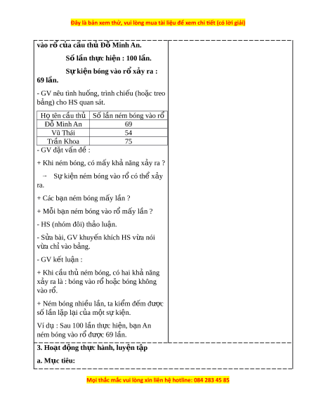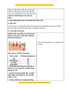 m phá, hình thành ki n t ế h c ứ m i ớ a. Mục tiêu: - HS làm quen và ki m ể đ m ế đư c s ợ l ố n l ầ p l ặ i ạ c a m ủ t ộ kh năng x ả y ả ra (nhi u ề lần) c a ủ m t ộ s ki ự ện khi th c hi ự n t ệ hí nghi m ệ nhi u ề l n. ầ b. Cách th c t ứ i n hành: ế Huấn luy n vi ệ ên ki m ể tra kĩ năng ném bóng vào r c ổ a ba c ủ u t ầ h và gh ủ i l i ạ k t ế qu ả b ở ng s ả au. - HS chú ý l ng nghe ắ và suy nghĩ tr l ả i ờ câu h i ỏ . K t ế qu s ả au 100 l n né ầ m bóng. H t ọ ên c u ầ