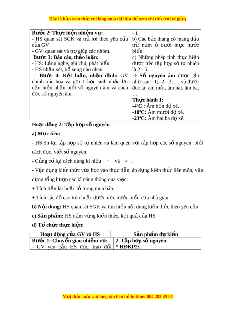 ợ số tự nhiên và làm quen v i ớ t p ậ h p ợ các số nguyên; bi t ế cách đ c, ọ vi t ế số nguyên. - C ng ủ cố l i ạ cách dùng kí hi u ệ ∈ và ∉ . - V n d ậ ng ụ ki n t ế h c v ứ a h ừ c ọ vào th c t ự i n, áp d ễ ng ki ụ n ế th c ứ liên môn, v n ậ d ng t ụ ổng hư p các kĩ ợ năng thông qua vi c: ệ + Tính ti n ề lãi ho c l ặ t ỗ rong mua bán. + Tính các đ cao ộ trên ho c d ặ ư i ớ m c ự nư c bi ớ n c ể a ủ nhà giàn. b) N i