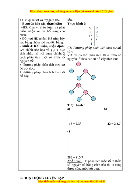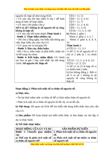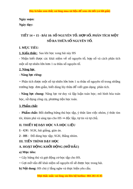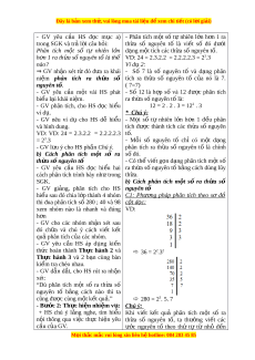 ứ : Sau khi h c ọ xong bài này HS - Nh n ậ bi t ế đư c ợ các khái ni m ệ về số nguyên t , ố h p ợ số và cách phân tích m t ộ số t nhi ự ên l n h ớ n ơ 1 ra th a ừ s nguyên t ố . ố 2. Năng l c ự - Năng l c ri ự êng: + Phân tích đư c ợ m t ộ số t ự nhiên l n ớ h n ơ 1 ra th a ừ s ố nguyên t ố trong nh ng ữ trư ng ờ h p đ ợ n gi ơ n, ả bi t ế dùng lũy th a ừ đ vi ể t ế g n d ọ ng ạ phân tích. - Năng l c ự chung: Năng l c ự tư duy và l p ậ lu n ậ toán h c; ọ mô hình hóa toán h c, s ọ ử d ng công c ụ , ụ phư ng t ơ i n h ệ c t ọ oán. 3. Ph m ẩ chất - Phẩm ch t ấ : Bồi dư ng h ỡ ng t ứ hú h c ọ t p, ý t ậ h c l ứ àm vi c nhóm ệ , ý th c t ứ ìm