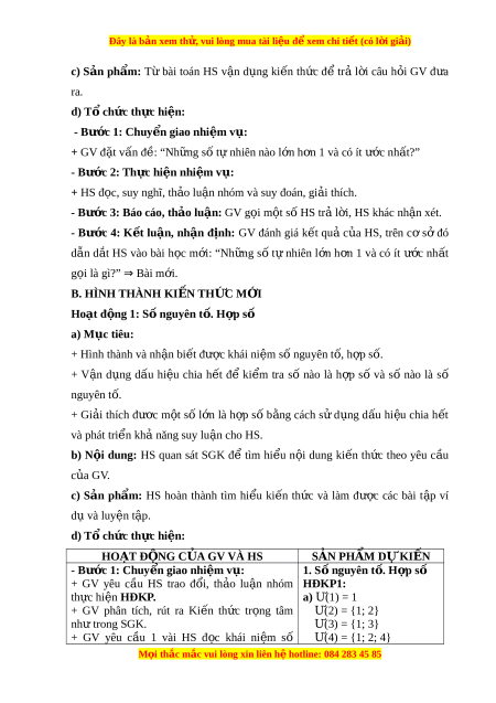 d) Tổ chức thực hi n: ệ HOẠT Đ N Ộ G C A Ủ GV VÀ HS SẢN PHẨM DỰ KI N Ế - Bước 1: Chuy n gi ể ao nhi m ệ v : ụ 1. Số nguyên t . H ố p s ợ ố + GV yêu c u ầ HS trao đ i ổ , th o ả lu n ậ nhóm HĐKP1: th c hi ự ện HĐKP. a) ( Ư 1) = 1 + GV phân tích, rút ra Ki n ế th c ứ tr ng ọ tâm ( Ư 2) = {1; 2} nh t ư rong SGK. ( Ư 3) = {1; 3} + GV yêu c u ầ 1 vài HS đ c ọ khái ni m ệ số ( Ư 4) = {1; 2; 4} M i ọ thắc m c