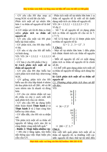 Đây là bản xem th , vu ử i lòng mua tài li u ệ đ xe ể m chi ti t ế (có l i ờ gi i ả ) - GV yêu c u ầ HS đ c ọ m c ụ a) - Phân tích m t ộ số t ự nhiên l n ớ h n ơ 1 ra trong SGK và tr l ả i ờ câu h i ỏ : th a ừ số nguyên tố là vi t ế số đó dư i ớ Phân tích m t