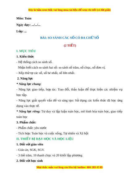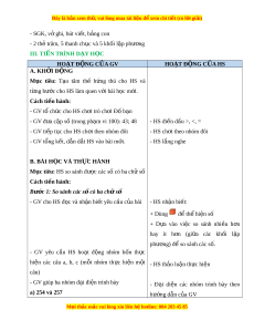Ngày dạy: .../.../... L p: ớ ... BÀI: SO SÁNH CÁC S C Ố Ó BA CH S Ữ Ố (2 TIẾT) I. M C Ụ TIÊU 1. Ki n t ế h c ứ - H t ệ hống cách so sánh s . ố Nh n ậ bi t ế cách so sánh hai s : ố so sánh s t ố răm, s ch ố c, s ụ đ ố n ơ v . ị - X p t ế h t ứ các ự số, số bé nh t ấ , s l ố n nh ớ t ấ . 2. Năng l c ự