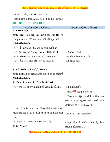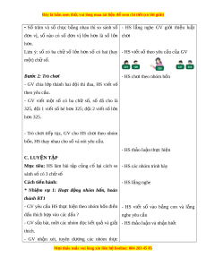 Đây là bản xem th , vu ử i lòng mua tài li u ệ đ xe ể m chi ti t (c ế ó l i ờ gi i ả ) - SGK, v ghi ở , bút vi t ế , b ng con ả - 2 th t ẻ răm, 5 thanh ch c ụ và 5 kh i ố l p ph ậ ư ng ơ III. TI N Ế TRÌNH D Y Ạ H C Ọ HOẠT Đ N Ộ G C A Ủ GV HOẠT Đ N Ộ G C A Ủ HS A. KH I Ở Đ N Ộ G Mục tiêu: T o ạ tâm thế h ng ứ thú cho HS và t ng b ừ ư c ớ cho HS làm quen v i ớ bài h c ọ m i ớ . Cách ti n hà ế nh: - GV tổ ch c ứ cho HS ch i ơ trò ch i ơ Đ b ố n ạ - GV đ a c ư p ặ s ( ố trong ph m ạ vi 100): 43; 48 - HS đi n d ề ấu >, <, = - GV ti p ế t c cho H ụ S ch i ơ theo nhóm đôi - HS ch i ơ theo nhóm đôi - GV tổng k t ế , d n d ẫ t ắ HS vào bài m i ớ . - HS l ng ắ nghe B. BÀI H C Ọ VÀ TH C Ự HÀNH