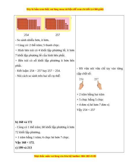 Đây là bản xem th , vu ử i lòng mua tài li u ệ đ xe ể m chi ti t (c ế ó l i ờ gi i ả ) 254 257 - So sánh nhi u h ề n, ơ ít h n. ơ + Cùng có: 2 th t ẻ răm; 5 thanh ch c. ụ + Hình bên trái có 4 kh i ố l p ậ phư ng ơ l , ẻ ít h n ơ 7 khối l p ph ậ ư ng ơ l c ẻ a ủ hình bên ph i ả . + Bên trái có số kh i ố l p ậ phư ng ơ ít h n ơ bên ph i ả . - HS v a ừ nói v a ừ chỉ tay vào t ng ừ - K t ế lu n: