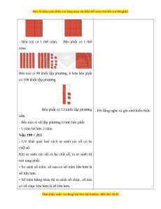 ự riêng: Tư duy và l p ậ lu n ậ toán h c, ọ mô hình hóa toán h c, ọ giao ti p ế toán h c ọ 3. Phẩm ch t ấ : - Ph m ẩ ch t ấ : yêu nư c ớ - Tích h p: ợ Toán h c và cu ọ c ộ s ng, ố T nhi ự ên và Xã h i ộ II. THIẾT B D Ị ẠY H C Ọ VÀ H C Ọ LI U Ệ 1. Đ i ố v i ớ giáo viên - Giáo án, SGK, SGV. - 3 th t ẻ răm, 10 thanh ch c ụ và 20 kh i ố l p ph ậ ư ng ơ 2. Đ i ố v i ớ h c s ọ inh M i