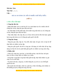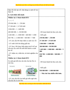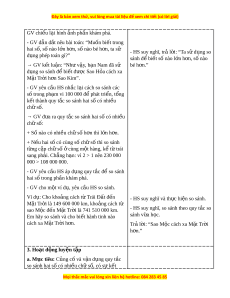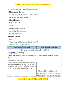 II. PHƯ N Ơ G PHÁP VÀ THI T Ế B D Ị Y Ạ H C Ọ 1. Phư ng ơ pháp d y h ạ c ọ - Vấn đáp, đ ng ộ não, tr c ự quan, ho t ạ đ ng nhóm ộ . - Nêu vấn đ , gi ề i ả quy t ế v n đ ấ . ề 2. Thi t ế b d ị y h ạ c ọ a. Đ i ố v i ớ giáo viên - Giáo án. - Bộ đồ dùng d y ạ , h c ọ Toán 4. - Hình v ẽ ph ở n K ầ hám phá. - Máy tính, máy chi u. ế b. Đ i ố v i ớ h c s ọ inh - SHS. - Vở ghi, d ng c ụ h ụ c ọ t p t ậ heo yêu c u c ầ a ủ GV. III. CÁC HO T Ạ Đ N Ộ G D Y Ạ H C Ọ Hoạt đ ng c ộ a gi ủ áo viên Hoạt đ ng c ộ a h ủ c s ọ inh TI T Ế 1: SO SÁNH S C Ố Ó NHI U Ề CH S Ữ Ố 1. Hoạt đ ng kh ộ i ở đ ng ộ a. Mục tiêu: T o t ạ âm th h ế ng t ứ