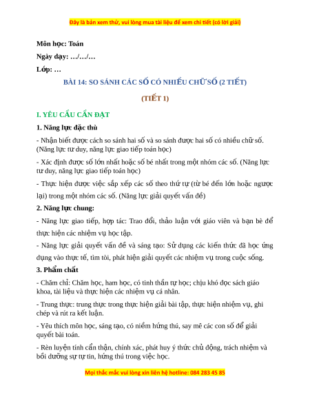 này “Bài 14: So sánh các h c ọ t p. ậ số có nhi u ch ề s ữ - ố Ti t ế 1: So sánh s có ố nhi u ch ề s ữ ố”. 2. Hoạt đ ng khá ộ m phá a. Mục tiêu: Th c ự hi n đ ệ ư c ợ vi c s ệ o sánh hai s và xác ố đ nh đ ị ư c s ợ l ố n nh ớ t ấ ho c ặ số bé nhất trong m t ộ nhóm các s có nhi ố u ch ề ữ s . ố b. Cách th c t ứ i n hành ế