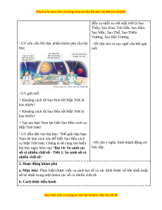 đ n xa ế nhất so v i ớ m t ặ tr i ờ là Sao Th y ủ , Sao Kim, Trái Đ t ấ , Sao H a, ỏ Sao M c, Sao ộ Thổ, Sao Thiên Vư ng, ơ Sao H i ả Vư ng. ơ - GV yêu cầu HS đ c ph ọ n khám ầ phá c a ủ bài - HS đ c bài ọ và suy nghĩ câu h i ỏ g i ợ h c. ọ m . ở - GV g i ợ m : ở + Kho ng cách ả t Sao K ừ im t i ớ M t ặ Tr i ờ là bao nhiêu? + Kho ng cách ả t Sao H ừ a t ỏ i ớ M t ặ Tr i ờ là bao nhiêu? + T i ạ sao b n N ạ am l i ạ bi t ế Sao H a cách ỏ xa M t ặ Tr i ờ h n? ơ - GV dẫn d t ắ vào bài h c: ọ “Đ gi ể i ả đáp b n ạ Nam đã làm cách nào đ bi ể t ế Sao H a cách ỏ xa M t ặ Tr i ờ h n. C ơ húng ta sẽ cùng tìm hi u ể