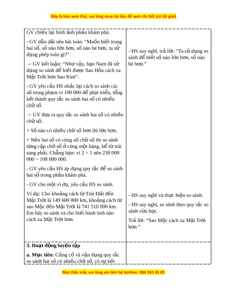 ắ nêu bài toán: “Mu n bi ố t ế trong hai số, số nào l n ớ h n, s ơ ố nào bé h n, ơ ta s ử - HS suy nghĩ, tr l ả i ờ : “Ta sử d ng s ụ o d ng phép t ụ oán gì?” sánh đ bi ể t ế số nào l n ớ h n, s ơ nào ố → GV k t ế lu n: ậ “Nh v ư y ậ , b n N ạ am đã s ử bé h n.” ơ d ng s ụ o sánh đ bi ể t ế đư c ợ Sao H a cách ỏ xa M t ặ Tr i ờ h n Sao K ơ im”. - GV yêu cầu HS nh c ắ l i ạ cách so sánh các số trong ph m ạ vi 100 000 đ phát ể tri n, ể t ng ổ k t ế thành quy t c ắ so sánh hai s có nhi ố u ề ch s ữ ố. → GV đ a ư ra quy t c s ắ o sánh hai số có nhi u ề ch s ữ ố: + Số nào có nhi u ề ch s ữ h ố n t ơ hì l n h ớ n. ơ + N u hai ế số có cùng số ch s ữ ố thì so sánh t ng c ừ p ặ ch s ữ ố cùng m ở t ộ hàng, k t ể t ừ rái sang ph i ả . Ch ng ẳ h n: ạ vì 2 > 1 nên 230 000 000 > 108 000 000.