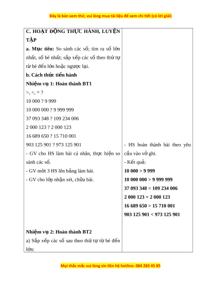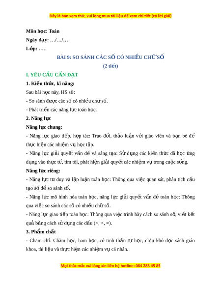 I. YÊU CẦU CẦN ĐẠT 1. Ki n t ế h c, kĩ ứ năng: Sau bài h c ọ này, HS s : ẽ - So sánh đư c ợ các số có nhi u ch ề s ữ ố. - Phát tri n các ể năng l c t ự oán h c. ọ 2. Năng l c ự Năng l c chung ự : - Năng l c ự giao ti p, ế h p ợ tác: Trao đ i ổ , th o ả lu n ậ v i ớ giáo viên và b n ạ bè để th c ự hi n các ệ nhi m ệ vụ h c t ọ p. ậ - Năng l c ự gi i ả quy t ế v n ấ đề và sáng t o: ạ Sử d ng ụ các ki n ế th c ứ đã h c ọ ng ứ d ng vào ụ th c t ự , t ế ìm tòi, phát hi n gi ệ i ả quy t ế các nhi m ệ v t ụ rong cu c s ộ ng. ố Năng l c ri ự êng: - Năng l c ự tư duy và l p ậ lu n ậ toán h c: ọ Thông qua vi c ệ quan sát, phân tích c u ấ t o ạ số đ s ể o sánh số. - Năng l c ự mô hình hóa toán h c, ọ năng l c ự gi i ả quy t ế v n ấ đề toán h c: ọ Thông