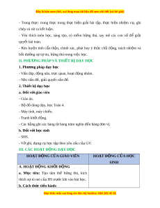 ậ chính xác, phát huy ý th c ứ chủ đ ng, ộ trách nhi m ệ và bồi dư ng s ỡ ự t t ự in, h ng t ứ hú trong vi c h ệ c. ọ II. PHƯ N Ơ G PHÁP VÀ THI T Ế B D Ị Y Ạ H C Ọ 1. Phư ng ơ pháp d y h ạ c ọ - Vấn đáp, đ ng ộ não, tr c ự quan, ho t ạ đ ng nhóm ộ . - Nêu vấn đ , gi ề i ả quy t ế v n đ ấ . ề 2. Thi t ế b d ị y h ạ c ọ a. Đ i ố v i ớ giáo viên - Giáo án. - Bộ đồ dùng d y ạ , h c ọ Toán 4. - Máy tính, máy chi u. ế - Tranh kh i ở đ ng. ộ - Các b ng ghi ả các hàng t hàng t ừ răm nghìn đ n ế hàng đ n v ơ . ị b. Đ i ố v i ớ h c s ọ inh - SHS. - Vở ghi, d ng c ụ h ụ c ọ t p t ậ heo yêu c u c ầ a ủ GV. III. CÁC HO T Ạ Đ N Ộ G D Y Ạ H C Ọ HOẠT Đ N Ộ G C A Ủ GIÁO VIÊN HOẠT Đ N Ộ G C A Ủ H C Ọ SINH A. HOẠT Đ N Ộ G KH I Ở Đ N Ộ G a. M c ụ tiêu: T o ạ tâm thế h ng ứ thú, kích thích sự tò mò c a H ủ S trư c khi ớ vào bài h c. ọ b. Cách th c ứ ti n hàn ế h: