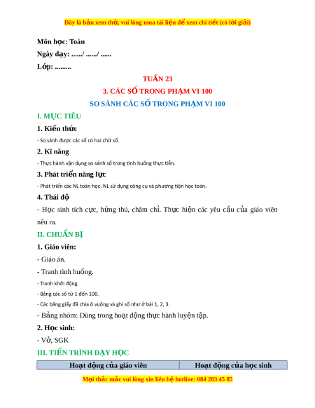 Ngày dạy: ....../ ....../ ...... L p: ớ ......... TUẦN 23 3. CÁC S Ố TRONG PH M Ạ VI 100 SO SÁNH CÁC S Ố TRONG PH M Ạ VI 100 I. M C Ụ TIÊU 1. Ki n t ế h c ứ