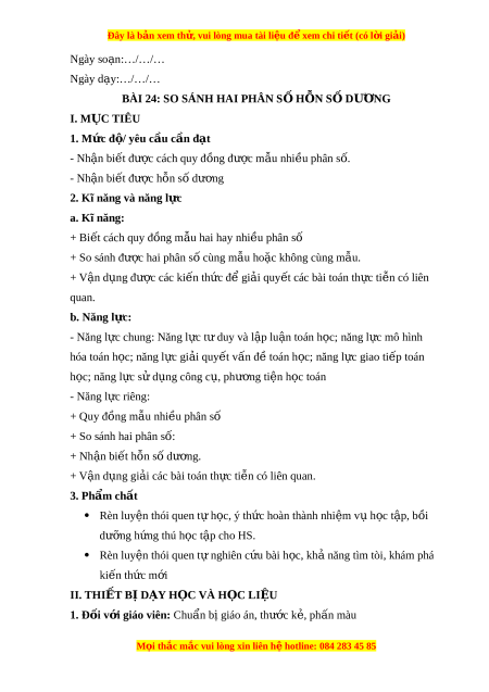BÀI 24: SO SÁNH HAI PHÂN S H Ố N Ỗ S D Ố Ư N Ơ G I. M C Ụ TIÊU 1. Mức đ / ộ yêu c u c ầ n đ ầ t ạ - Nh n ậ bi t ế đư c ợ cách quy đ ng đ ồ ư c m ợ u nhi ẫ u phân s ề . ố - Nh n ậ bi t ế đư c ợ h n s ỗ d ố ư ng ơ